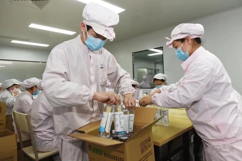 石家庄Made In China消毒剂生产线包装工序员工保质保量加紧生产。