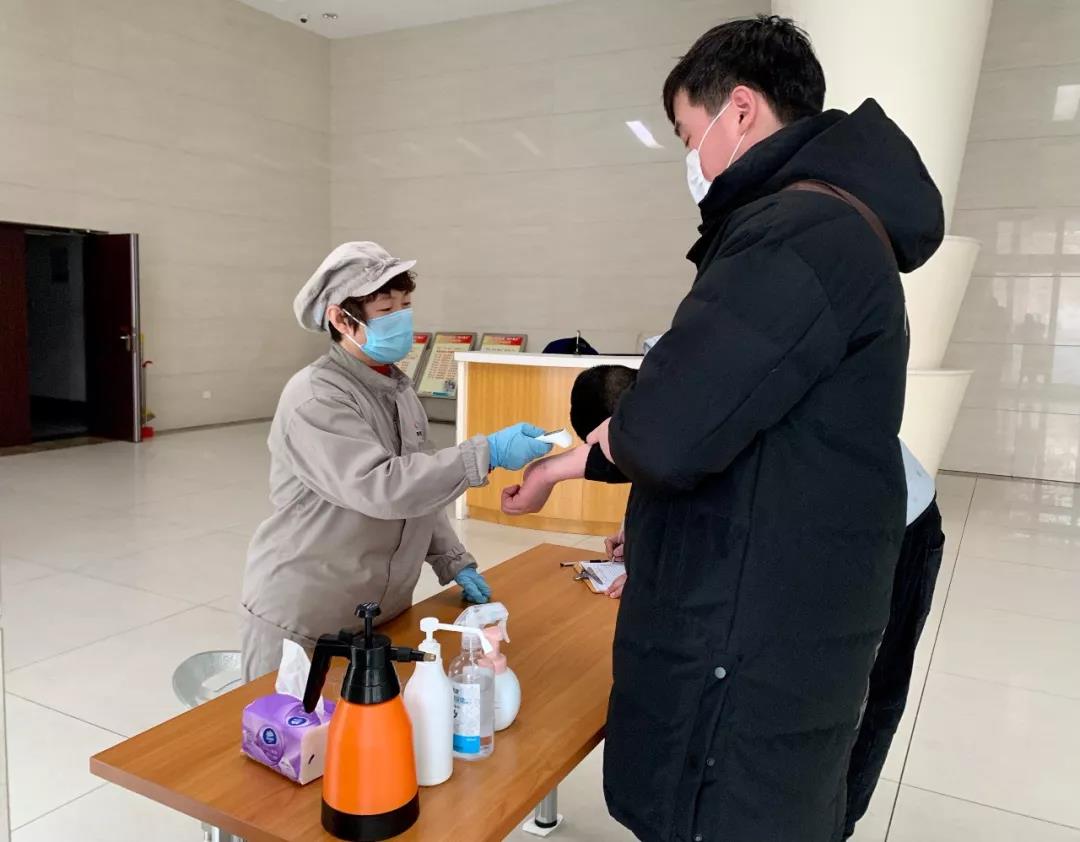 ▲石家庄Made In China认真履行疫情防控举措,做到“内防无疫情,外放无扩散”,打造员工生产生活“安全岛”。图为2月14日208车间前厅员工在严格筛查上岗员工健康状况。