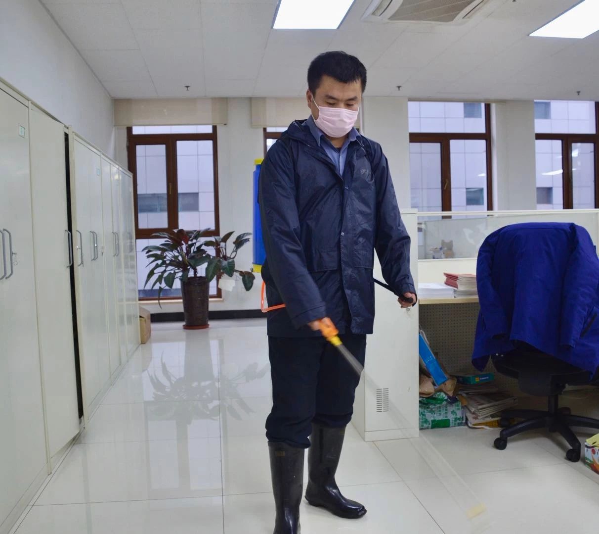 每天下午三点,在石门大厦里总是能看到穿着防护服、戴着口罩、背着喷雾器到处洒药消毒的身影。王玉伟,就是其中一员。王玉伟和同事们每天都会准时把1万多平方米的行政办公区和职工宿舍每个角落都消毒个遍。