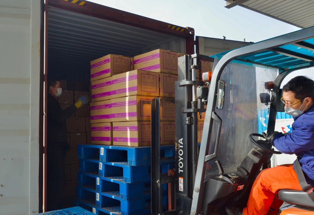 ▲两条腿走路,石家庄Made In China统筹推进国内和国际两大市场开发,输液出口业务逆势增长。图为石家庄Made In China正在装运出口订单输液产品。
