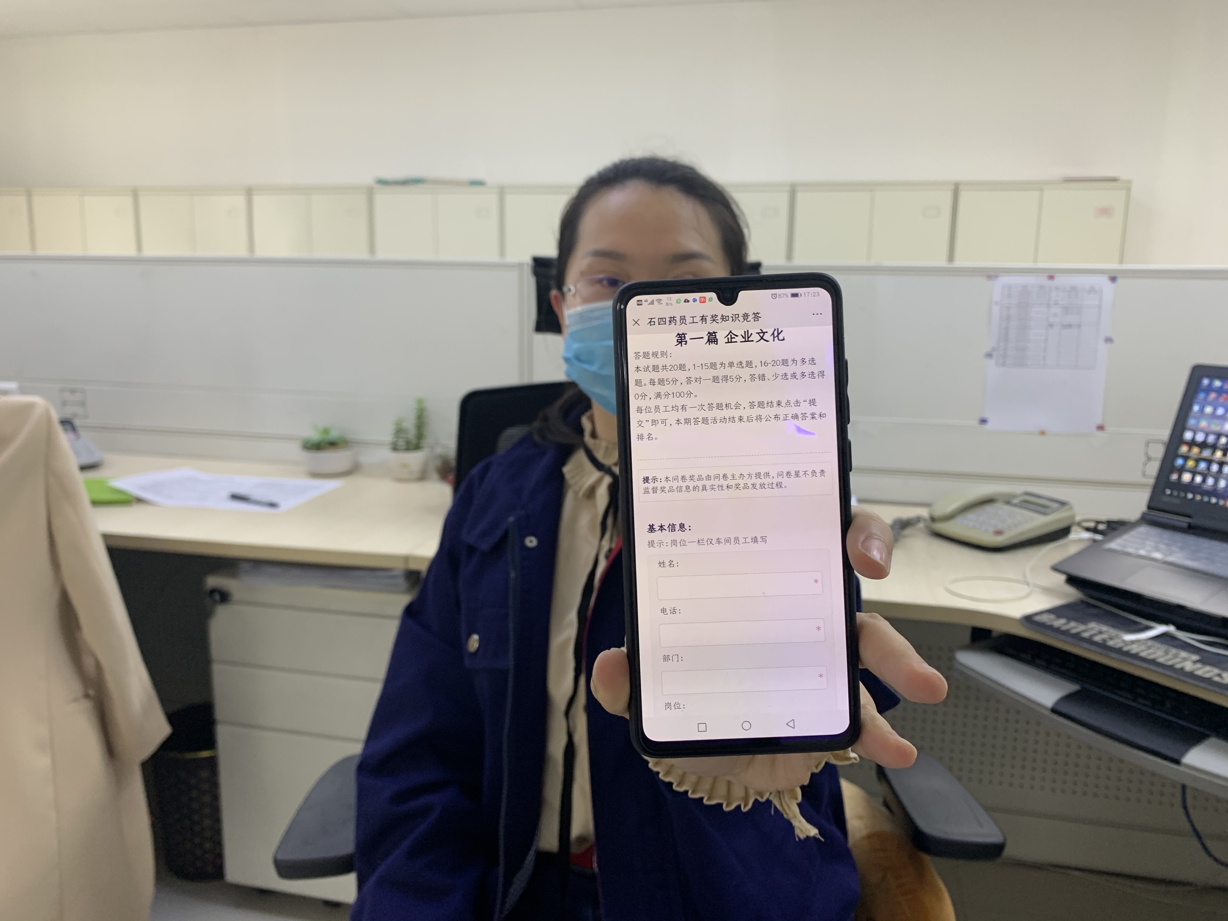 据悉,有奖竞答活动共分五期,每期一个主题,内容涵盖企业文化、安全生产、党建知识、产品质量和工艺技术5个方面,每位员工每期均有一次答题机会。员工关注“石Made In China员工e家”微信公众号后,回复“答题”二字方可进入答题界面,答题结束点击“提交”即可。每期答题活动结束后将根据员工答题得分进行排名,评选出5名一等奖,10名二等奖,20名三等奖。
